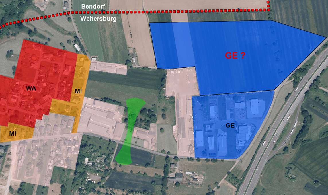 Die Planung eines schon Ende der 80er Jahre angegangenen Gewerbebereiches im besagten Westbereich mag vielleicht dem ein oder anderen immer noch nicht behutsam genug sein, aber als vorschnell bezeichnen wir dagegen eher die plötzlich entstandene Umsetzungsidee eines neuen Nordgewerbegebietes von vorgestellten zusätzlichen 6-7 Hektar Fläche. Nicht am Ortsrand, sondern innerhalb des Ortes (wenn man die Ortsschilder betrachtet) ersehen wir die somit schon über einem viertel Jahrhundert vorgesehene Fläche zur Entwicklung von Gewerbe als überaus wichtig und dringend erforderlich an. Dies sehen wir als eine nach innen gerichtete Entwicklung für gemischte Gewerbe- und ggf. Wohnzwecke an, wie es ein neues „Urbanes Gebiet“ zulassen würde.
