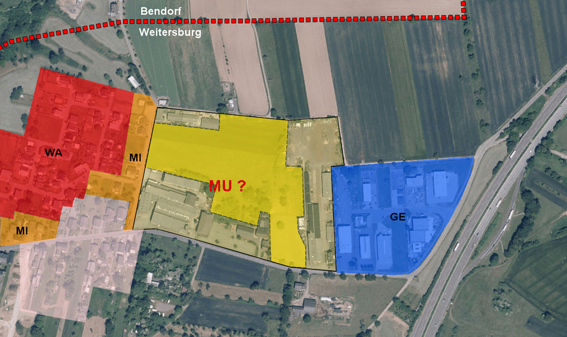 Es würde sich hier somit ein fließender und angepasster Bau- und Nutzungsübergang von allgemeinem Wohngebiet (MA) über Mischgebiet (MI) und “urbanem Gebiet” (MU) zu Gewerbegebiet (GE) ergeben, mit entsprechender Ordnung und Reglementierungen und mit einem ebenso langsam abgestuften „Wohnen zu Gewerbe“-Übergang.