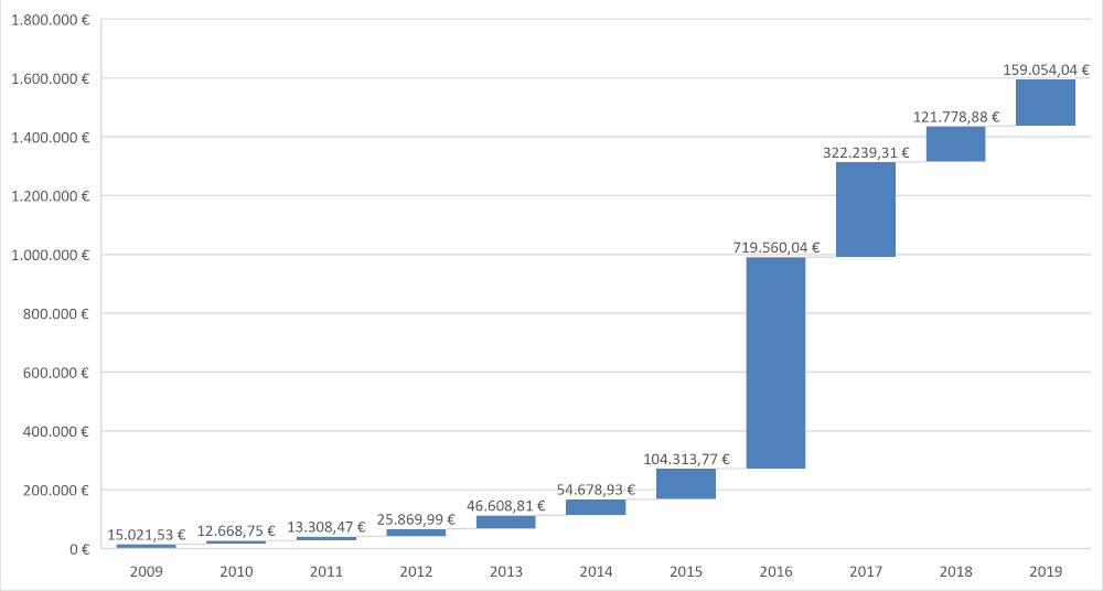 In diesem Zeitraum hat die Gemeinde aber auch hohe Schulden angehäuft, die maßgeblich durch den Kindergartenneubau entstanden sind. Seitdem konnten jedoch beachtenswerte Schuldentilgungen von insgesamt über 1 Mio Eur geleistet werden, was durch die stark gewordene Gewerbesteuer ausgesprochen unterstützt wurde.