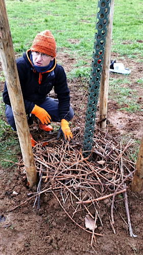 Im Anschluss wurden die Bäume mit dem aufgearbeiteten Boden und reichlich Wasser eingeschlemmt. Zum Aufarbeiten des Bodens verwendeten die Männer Pferdemist, der hierfür als besonders geeignet gilt.