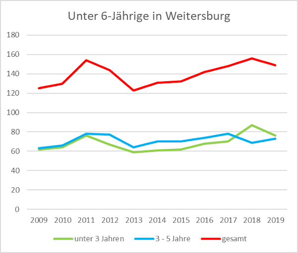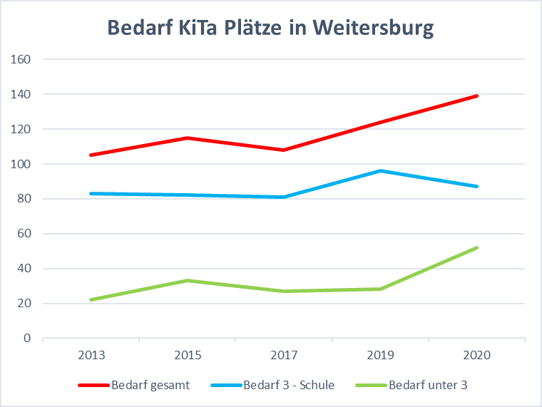 … wobei sich der erwartete Bedarf nach den Bedarfsplänen des Kreisjugendamtes in Weitersburg in der Altersgruppe “von 3 bis Einschulung” nicht wesentlich von 81 Kindern in 2013 zu 87 Kindern in 2020 erhöht hat.
