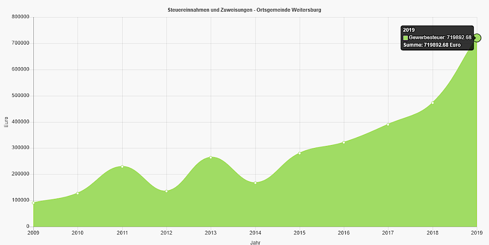 Damit hat die Gewerbesteuer gegenüber 2009 (100% bei ca. 155.000 Euro) nun im Jahr 2019 über 670% erreicht bei ca. 720.000 Euro.