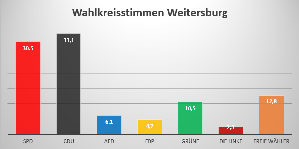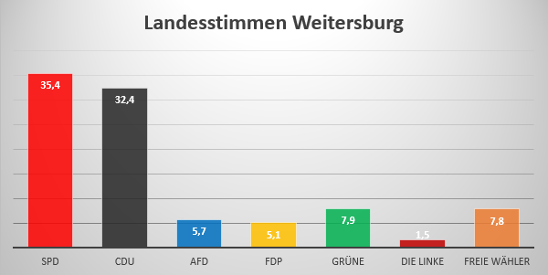 In Weitersburg konnten die FREIEN WÄHLER in den Landesstimmen 7,8% holen und damit den zweithöchsten Zuwachs von PLUS 3,2%-Punkten mehr als zur Landtagswahl 2016 gewinnen.